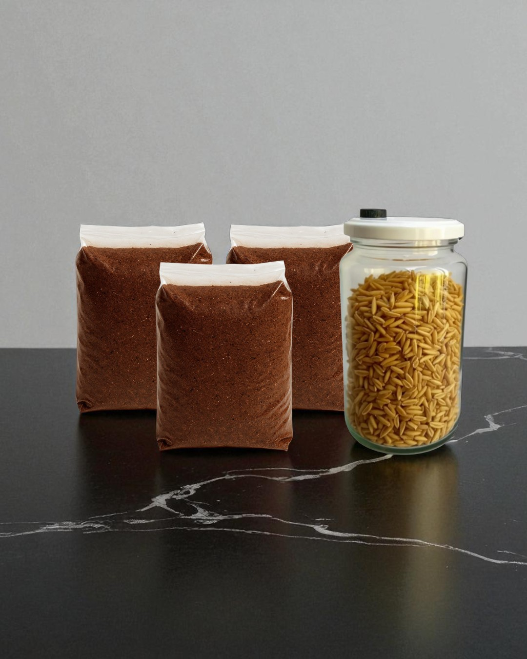 Mix de sustrato estéril: elaborado con madera y compost o fibra de coco, asegurando un ambiente rico en nutrientes para la fructificación.